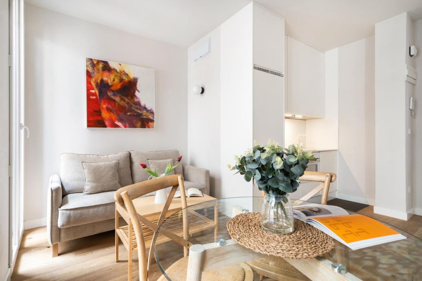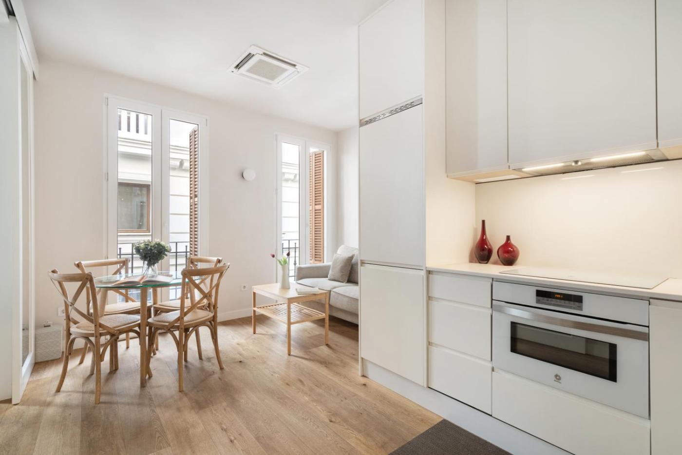 El Room Cibeles presenta una decoración elegante y luminosa. Dispone de suelo de parqué, cocina totalmente equipada con lavadora, horno y microondas y salón con zona de comedor, sofá cómodo, TV y mesa de comedor. Las habitaciones son acogedoras y el baño cuenta con bañera o ducha y secador de pelo.